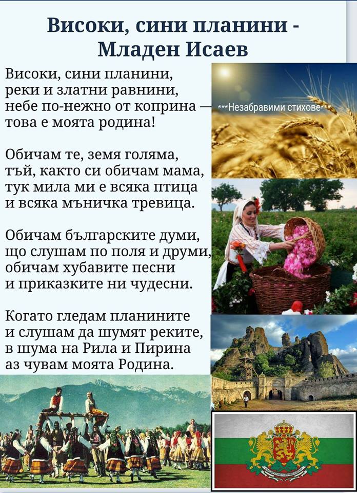 Visoki Sini Planini Reki I Zlatni Ravnini Nebe Po Nezhno Ot Koprina Tova E Moyata Rodina Obicham Te Zemya Golyama Tj Kakto Si Obicham Mama Tuk Mila Mi E Vsyaka Ptica I Vsyaka Mnichka Trevica Obicham Blgarskite Dumi Sho Slusham Po